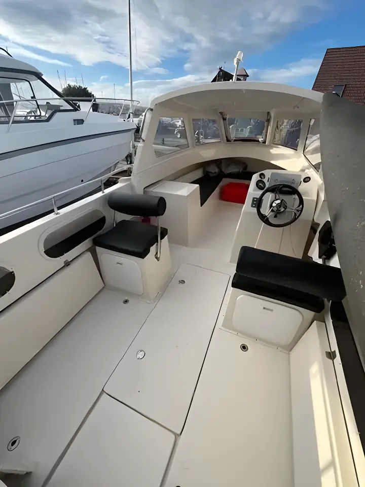 The open backed wheelhouse/ cuddy has seating either side. There is a forward opening hatch giving access to the anchor locker. The helm is to starboard, wheel steering with engine controls and navigation equipment.