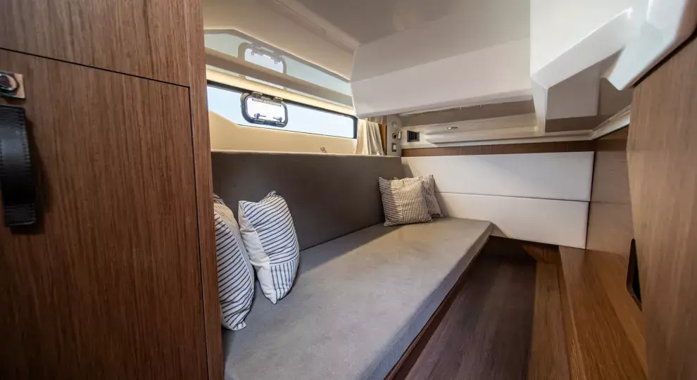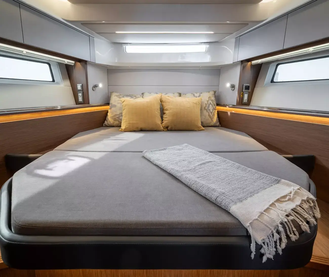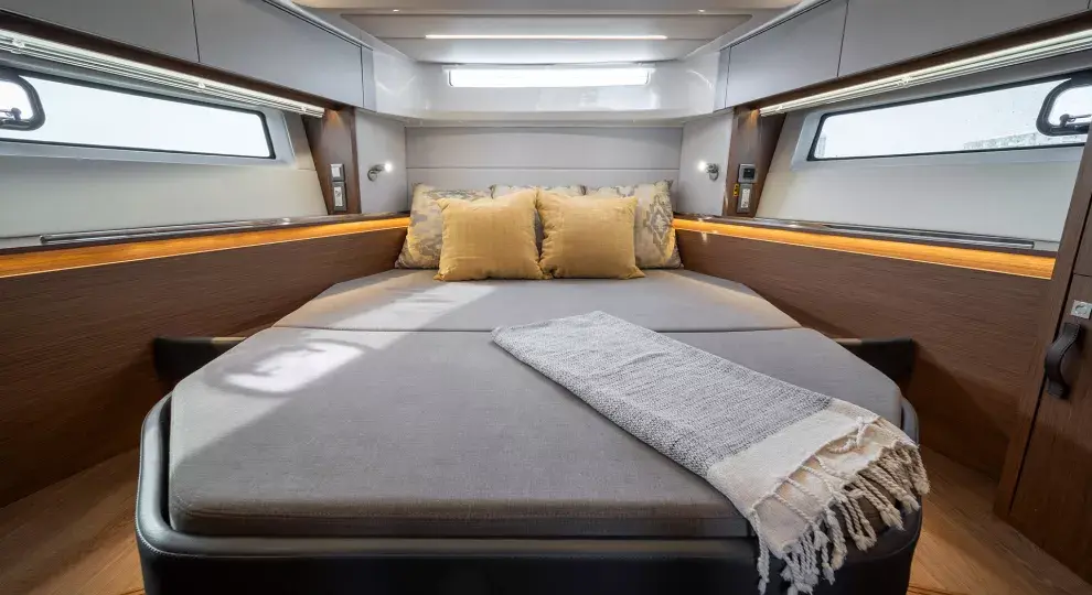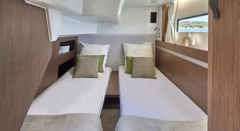 The Antares 12 Coupe, ideal for family cruises or short trips with friends, is the perfect blend of modularity and space. The spacious, bright and elegant master cabin has its own bathroom, just like the guests, who benefit from a fully equipped cabin. A third modular area can be transformed as needed into an extra bunk or storage space. Combined with the convertible wheelhouse seating area, the Antares 12 Coupe can accommodate up to eight people on board for a wonderful night at anchor off the coast.