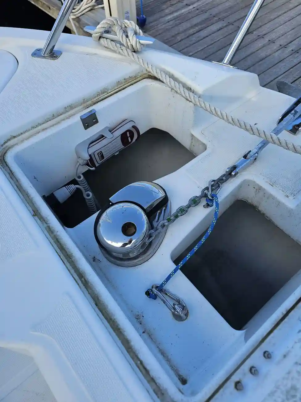 - Electric windlass with anchor and 30m chain, cabin and local control – installed 2023