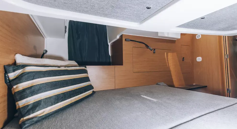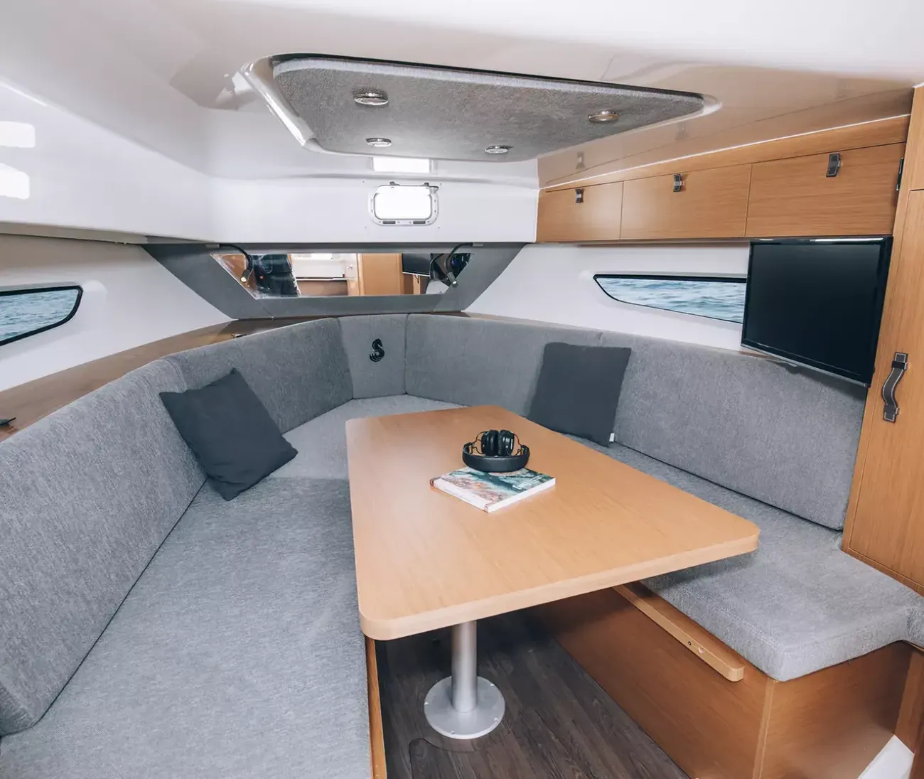 Bordering on a sport cruiser, the Flyer 10 provides unique living space. The two double berths, divided among a saloon cabin and a mid-cabin, mean that you can spend a few nights on board.The boat is truly comfortable with a proper shower room, with a head separate from the shower, in addition to a large storage space at the foot of the stairway.Two long hull windows pleasantly bathe the interior in light.