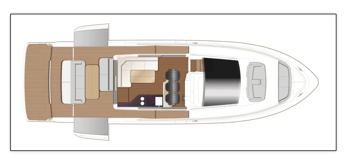 The Deck Saloon variant offers a blend of enclosed luxury and open-air freedom. A fully enclosed saloon with lounge and galley areas is complemented by a helm station, with triple sliding patio doors, twin helmsman doors, and an optional sliding roof to open the space and create a seamless inside-outside experience. The exterior provides inviting cockpit dining and foredeck seating areas. For models equipped with inboard engines, an optional up/down hydraulic transom platform enhances ease of water access.