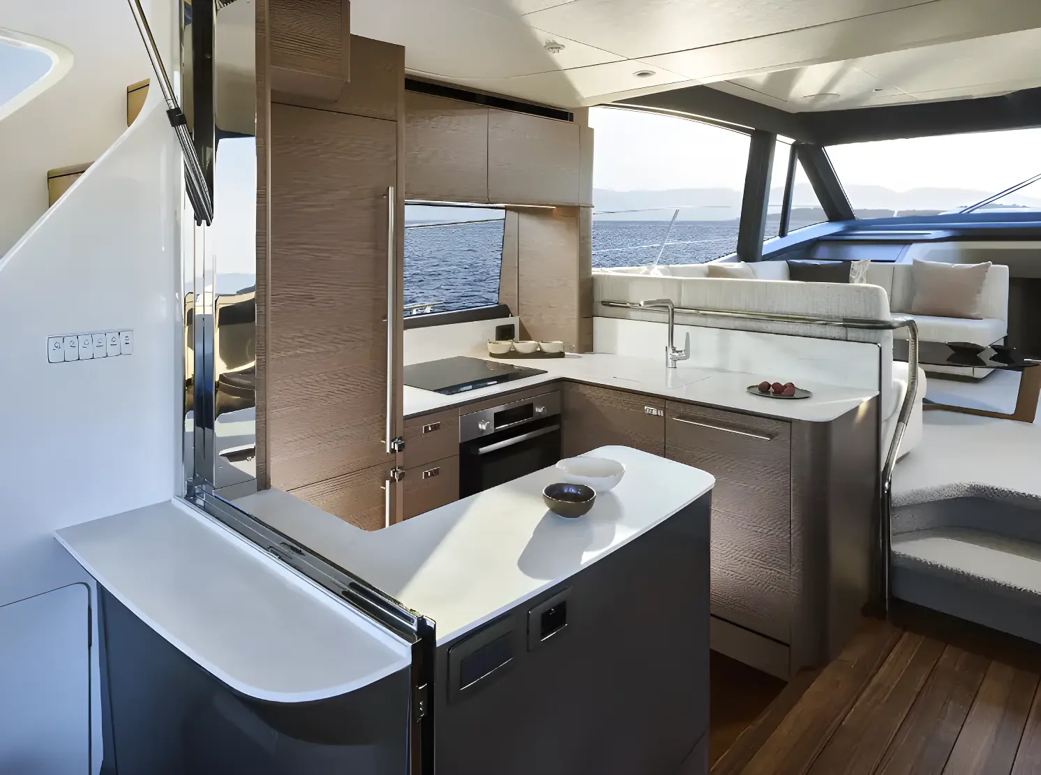 The deck space extends far beyond the flybridge, as the foredeck offers an expansive terrace, a design feature inspired by larger Princess models. Twin sunpads can be enjoyed here, with the option for a coolbox and adjustable headrests that turn the pads into aft facing seating. In the cockpit is a seamless space that blends into the saloon and galley, and back down to the bathing platform, complete with mini “beach club” transom, with space for you to store water toys or enjoy a barbecue, thanks to the sink and fold down seat.