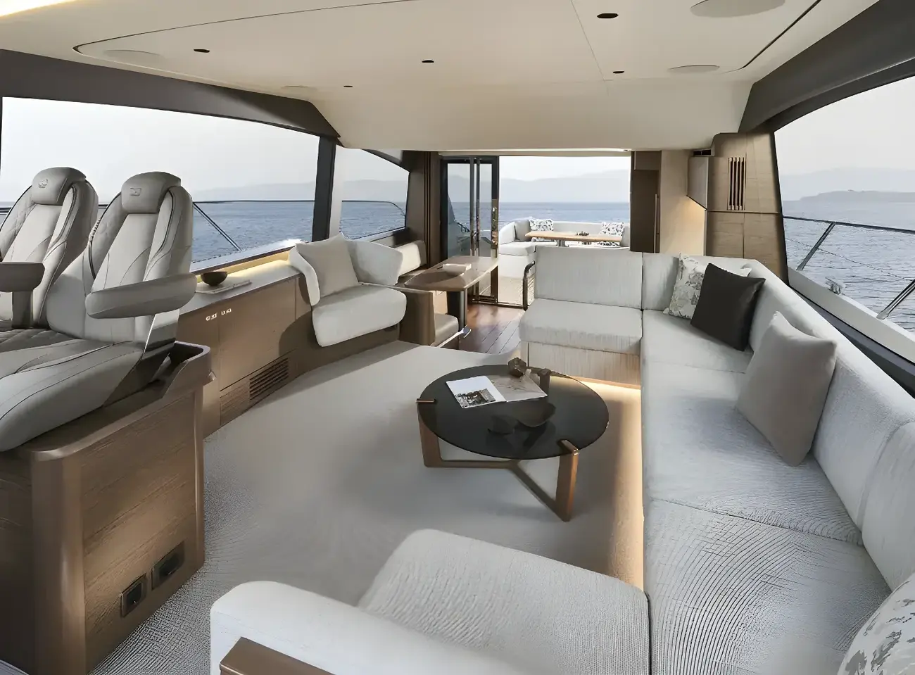 Inside you can enjoy a bright saloon fitted with panoramic windows, a U-shaped sofa, a convertible coffee and dining table, and dining space that makes this the ideal space to relax indoors. As you would expect, the lower deck is fitted with three cabins; the forward VIP guest cabin, starboard twin cabin and a full beam owner’s stateroom, with a breakfast area, ensuite bathroom and even a walk-in wardrobe. For those looking for crew on board, an option for a single aft crew cabin with ensuite and storage is available.