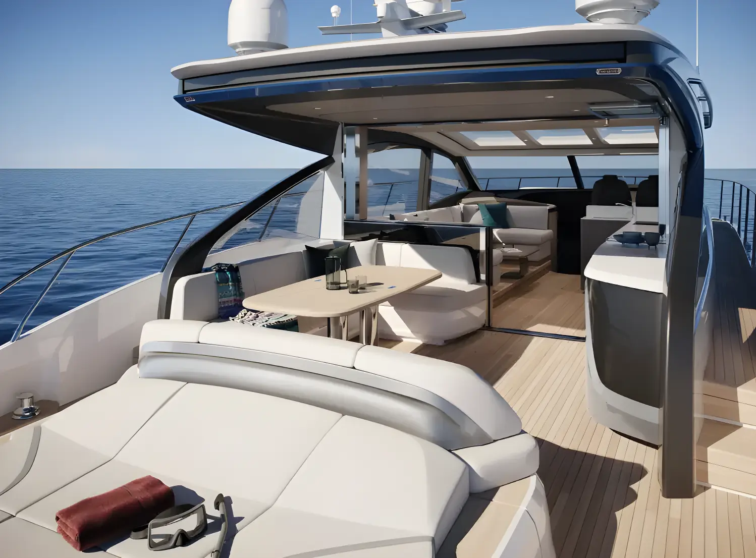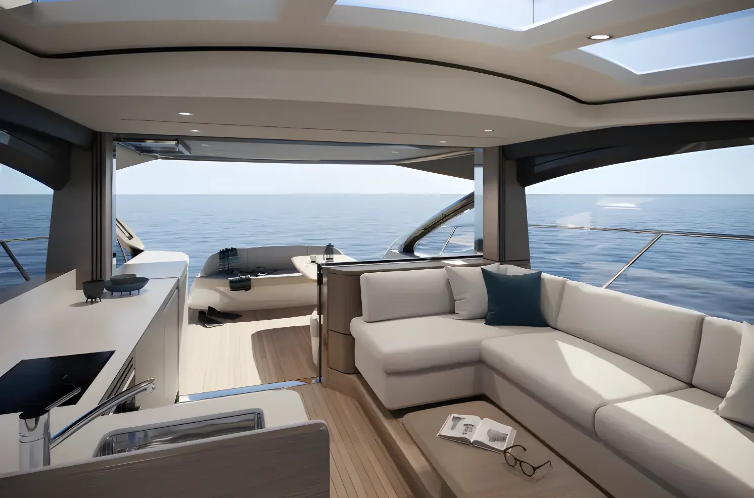 Clearly distinct of the V Class range are the clear sweeping lines, accentuated by the panoramic knife-shaped hull windows drawing in natural light and opening the interior out to the world around. The dynamic profile of the V55 conceals a spacious interior, perfect for relaxing or making longer journeys in supreme comfort. Access to the interior is via the hydraulic bathing platform, leading to a teak deck which runs throughout the living area. The cockpit connects to the main saloon via a cleverly concealed drop-down sliding patio door, seamlessly integrating both living areas. Plus, with the electric opening sunroof over the main deck, you can truly open yourself up to the elements.