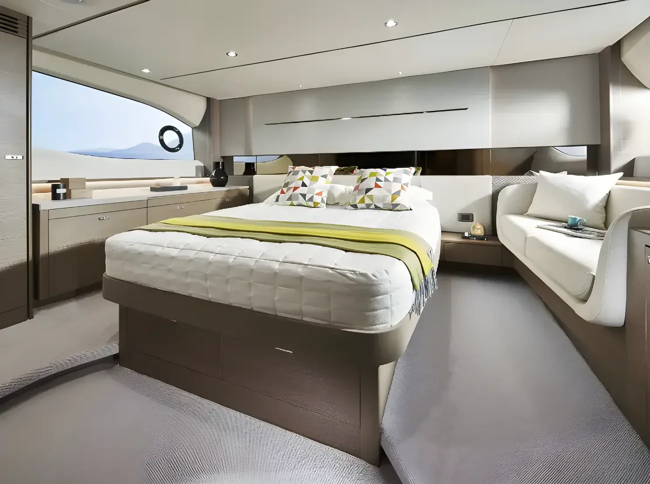 Below deck, there is spacious accommodation for up to six guests across three beautifully appointed cabins, including an impressive full-beam master stateroom with a large double bed – thanks to the space created within the resin-infused deep-V hull of this craft.
