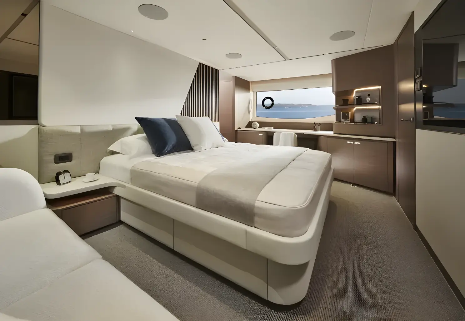 The full beam master stateroom takes pride of place, with its own private entrance via spiral staircase from the saloon providing ample storage space, a large ensuite bathroom plus an LED TV with Naim audio. Further aft there is an exclusive crew area (or an optional guest cabin) featuring two single berths and a private ensuite.