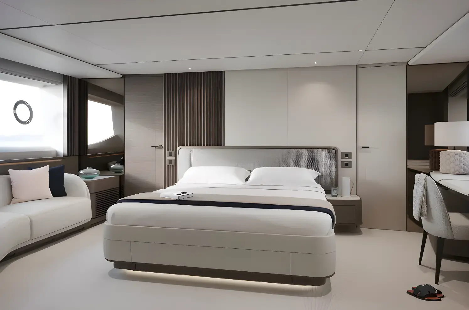 Offering a generous beam, the Y80 provides significant volume for an 80-foot motor yacht, whilst retaining elegant styling and design, both inside and out. The voluminous main deck offers an uninterrupted flow through from cockpit to the helm area, combined with panoramic views from the vast windows through-out the saloon. There is a seamless connection of each zone, from living area to dining arrangement, from well-equipped galley to day head, through to the wheelhouse with helm station and companion seating.