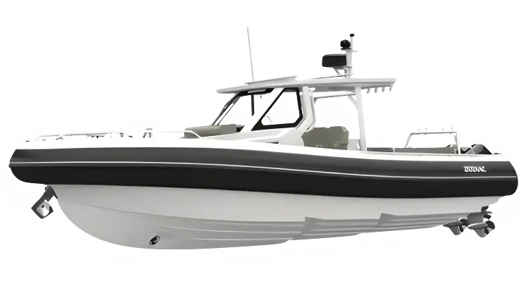 With a 2 x 400 HP Mercury engine, our tests have shown that it consumes just 3L / nautical mile. It can reach a top speed of 60 knots with 7 people on board. This weight/power ratio means it consumes 30% less fuel than a rigid boat of the same size. Its 760-liter fuel tank gives it a range of around 250 nautical miles.